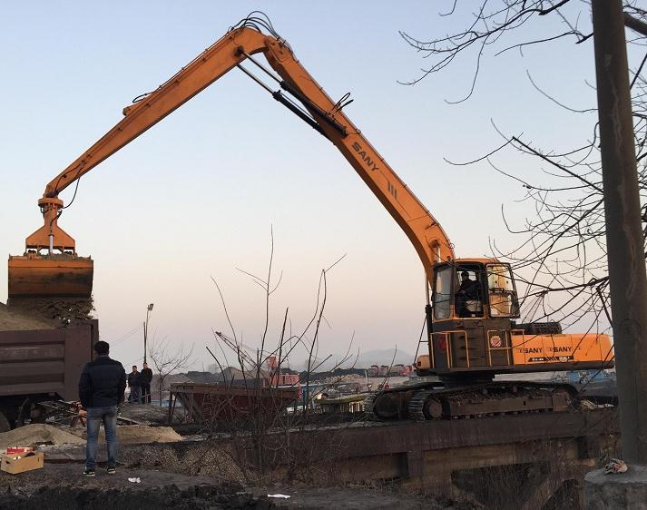 这样的事例其实并不欠缺,但是除了凿地面、运泥土之外,挖掘机加长臂这位生活中的巨人还有其他方面的特长。例如在拆除破旧房子的时候,它的好处也能显示出来,人们先用破壁机将楼面捣碎,然后在挖掘机加长臂前换装挖掘机挖斗来清理捣碎的水泥土块,也还可以换装挖掘机抓斗来收集散落的钢筋条。
